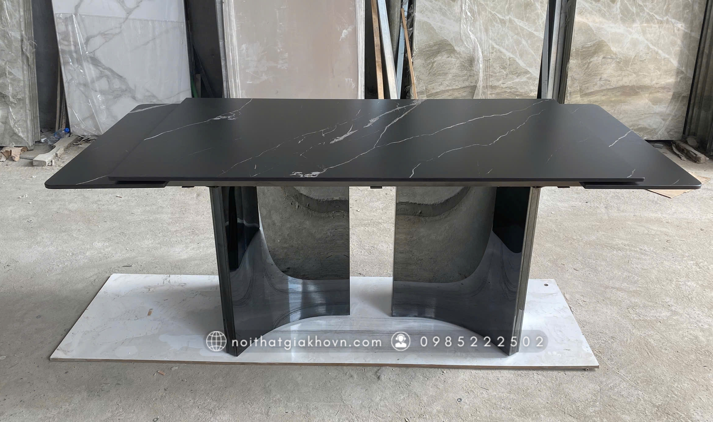 Sở hữu chân bàn inox nhập khẩu cao cấp kết hợp với mặt đá ceramic chống trầy xước, chống thấm, chịu nhiệt tốt, mẫu bàn này không chỉ đảm bảo độ bền vượt trội mà còn mang lại vẻ đẹp tinh tế, phù hợp với nhiều phong cách nội thất.
