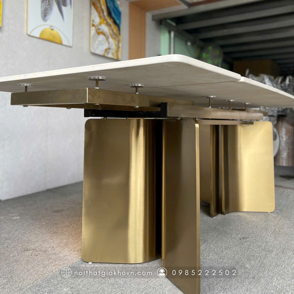 Điểm nổi bật đầu tiên của BA - TM 031 chính là phần chân bàn được chế tác từ inox 304 mạ vàng gold xước PVD – công nghệ mạ hiện đại nhất hiện nay, giúp lớp màu bền bỉ. Thiết kế chân bàn vững chãi nhưng mềm mại, tạo nên sự thanh thoát, sang trọng cho tổng thể.
